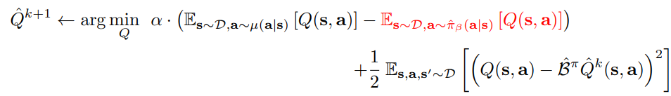 위 수식은 CQL 논문의 2번 수식이다. $\mu$는 uniform distribution이라고 생각하면 되고 $\hat{\pi}_{\beta}$는 emprical distribution으로 데이터셋의 action 분포라고 생각하면 된다. 위 수식의 첫번째 텀은 uniform 분포에서 나온 action들은 Q가 낮아지도록 유도하는 것이고 두번째 텀은 emprical distribution에 대한 Q가 높아지도록 유도하는 것이다. 세번째 텀은 일반적으로 Q를 학습할때 사용하는 bellman equation을 TD로 푸는 것이다. 즉 dataset에 있는 action을 고평가 하고 dataset에 없는 action은 저평가 하겠다는 것으로 볼 수 있다.