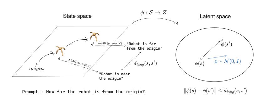 그림을 해석하자면, 프롬프트로 'how far the robot is from the origin'과 state를 통해 나온 'robot is far from the origin'과 'robot is near the origin'을 pretrained된 sentence-transfer을 이용해 fixed-vector로 바꾸고 거리를 계산함. 이걸 $d_{lang}$이라고 부르자. 그리고 우리는 $d_{lang}$이 먼 상태들을 많이 방문하고 싶다. -> 이게 의미적으로 멀다는걸 뜻하니까.