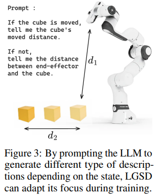 물체가 움직이지 않을 경우 물체와 로봇 팔 사이의 거리 $d_1$을 설명하도록 하고 로봇 팔이 큐브에 도달했을때 물체가 이동한 거리 $d_2$를 설명하도록한다. 그럼 의미적으로 $d_1$을 설명할때와 $d_2$을 설명할때 $d_{lang}$의 차이가 크기 때문에 $d_1$을 기술하다가 $d_2$를 기술하는 상태를 자주 방문하고 싶어할 것이다.