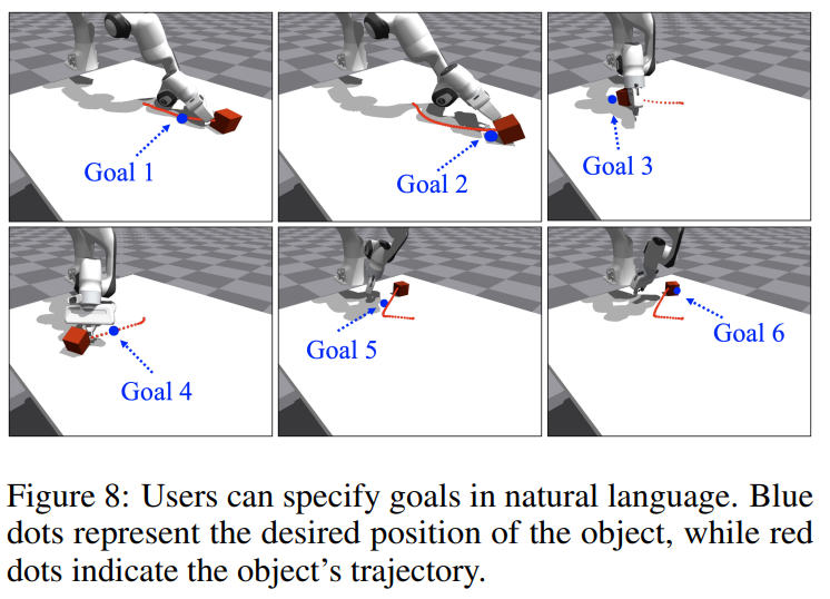 마지막으로 $\psi(z|f_{embed}(l_{desc}))$의 효과를 보이는 실험이다. 조금 더 자세히 말하자면 $\psi$를 통해 원하는 목표 상태에 도달하기 위한 스킬을 $z$ 차원에서 추론하는 것이다. 예를 들어 '물체가 [0.3, 0.2]'에 있다 와 같은 단순한 설명에는 로봇의 위치나 자세가 포함되어 있지 않음에도 $\psi$를 통해 물체를 원하는 위치로 이동시키는 시나리오를 얻을 수 있다. 이로써 zero-shot 방식으로 큐브를 원하는 위치에 가져다 놓을 수 있는 policy를 얻을 수 있다.