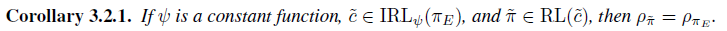 여기서 Corollary 3.2.1이 말하는 바는 regularizer를 constant로 두면, Proposition 3.2를 풀었을때 얻는 정책은 expert의 정책과 동일하다는 것입니다.