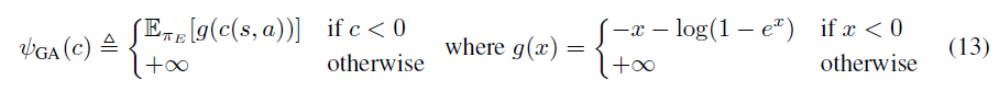 먼저 convexity를 살펴보면 $\phi$가 convex하기 때문에 $g_{\phi}$도 convex하고 $\rho_{\pi_{\mathit{E}}}(s,a)$의 정의를 잘 보면(논문 page 3에 있습니다) 각각의 $\rho_{\pi_{\mathit{E}}}(s,a)$를 어떤 상수로 생각할 수 있기 때문에 $\rho_{\pi_{\mathit{E}}}(s,a)g_{\phi}c(s,a)$도 convex하고 convex의 합은 convex이기 때문에 $\psi$도 convex합니다.