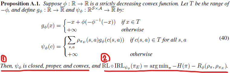 그전에 잠시 2가지 내용을 미리 숙지하셔야합니다. 첫번째로는 MaxEntIRL식을 일반화하기위해 GAIL의 식(3)과 같이 Regularizer를 추가해줍니다. 이때 $\psi$는 convex하다고 합시다.(Regularizer를 추가하는 것이 왜 일반화되는 것인지는 section3에서 설명 합니다)