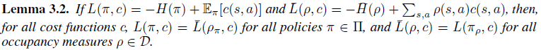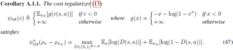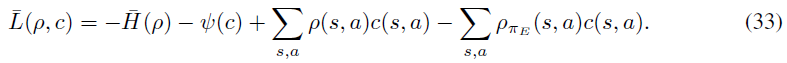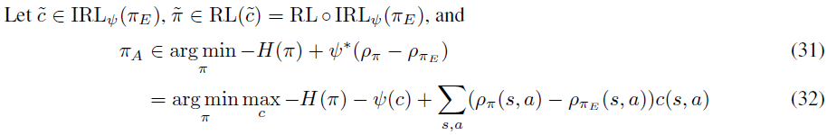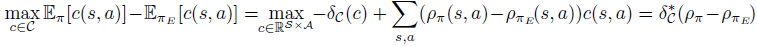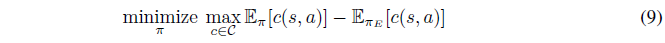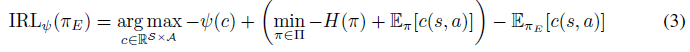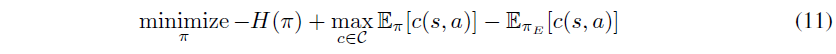$=\underset{\theta}{\max}-\mathbb{E}_{\pi_{E}}[c(s,a)]+\underset{\pi}{min}(\mathbb{E}_{\pi}[c(s,a)]-\mathit{H}(\pi))$