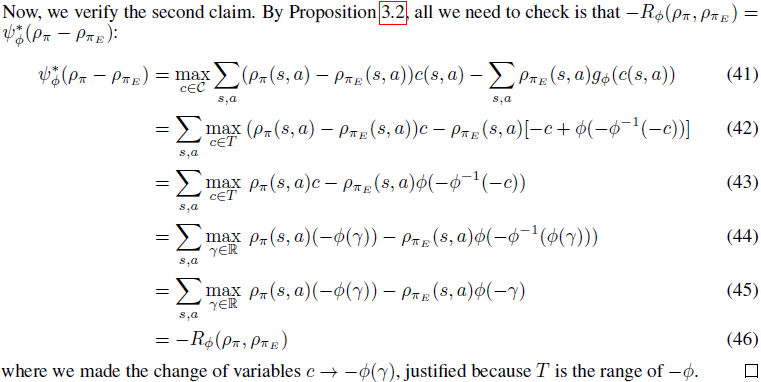 이제 Appendix A.1의 Proof of Proposition 3.2로 넘어가보겠습니다. 저희는 식(31,32 혹은 34)로 얻은 policy가 식(35,36)으로 얻은 policy가 같다는 것을 증명하면 됩니다.(여기서 식(35,36)으로 얻은 $\rho$는 GAIL의 식(3)으로 얻은 $\pi$와 동일합니다-Proposition 3.1)
