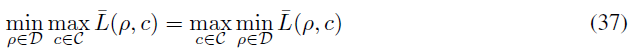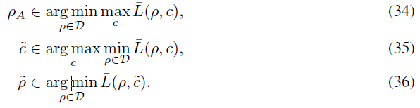 이를 조금 더 풀어서 설명하자면 식(35)에서 $\tilde{c}$를 찾을때 $\bar{\mathit{L}}(\rho,c)$을 최소화하는 $\rho$를 먼저 찾아야하지만 이러한 과정없이 c에 대해 $\bar{\mathit{L}}(\rho,c)$를 최대화하는 $\tilde{c}$를 찾아도 같은 $\tilde{c}$를 얻을 수 있다는 뜻입니다. 이렇게 얻은 $\tilde{c}$를 식(36)번에 대입하게 되면 정확히 식(34)와 같아지게 됩니다. 이로써 Proposition 3.2를 증명하였습니다.