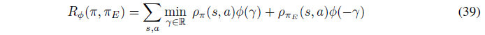 $=\underset{\theta}{\max}\mathbb{E}_{\pi_{E}}[r(s,a)]-\mathbb{E}_{\pi}[r(s,a)]-\mathit{H}(\pi)$