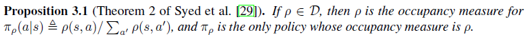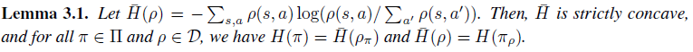 이를 위해 가장 먼저 봐야할 부분은 Proposition 3.1과 Lemma 3.1입니다. 이에대한 증명은 각각 refer[29]와 Appendix A.1(추가로 refer[6]의 page32-2.106을 보시면 됩니다)에 나와 있으니 읽어보시면 됩니다. 여기서 중요한 점은 $\pi_{\rho}$와 매칭되는 occupancy measure $\rho$는 유일하다는 것(Proposition 3.1)과 $\bar{\mathit{H}}$가 strictly concave라는 점(Lemma 3.1)입니다.