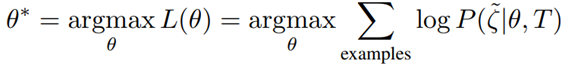 $P(\tau|\theta) = {1 \over Z}e^{r(\tau)} \rightarrow \underset{\theta}{argmax}\underset{examples}{\Sigma}\log{P(\tilde{\tau}|\theta)} = \underset{\theta}{argmax}\underset{examples}{\Sigma}\log{{e^{r(\tilde{\tau})}} \over \int e^{r(\tau|\theta)} d\tau}$