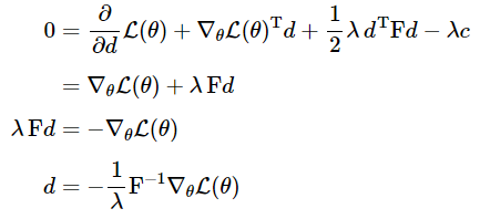 (KL-divergence는 테일러 급수의 두 번째 항으로 근사하였고, $\mathcal{L}(\theta+d)$는 테일러 급수의 첫 번째 항으로 근사하였습니다.) 이 최소화 문제를 풀기 위해 라그랑지안을 $d$에 대해 미분하고 이를 0으로 만드는 $d$를 구해봅시다.