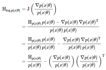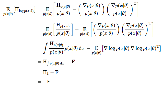 우리가 알 수 있는 한가지 놀라운 성질은, 앞에서 얻은 피셔 정보 행렬$F$는 우리 모델의 log-likelihood에 대한 음의 Hessian 기댓값(negative expected Hessian)과 같다는 것입니다. 이 성질에 대한 증명은 아래와 같습니다.