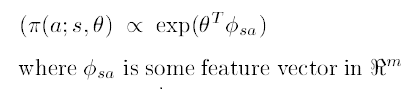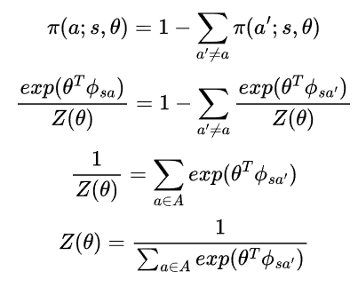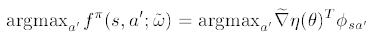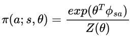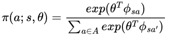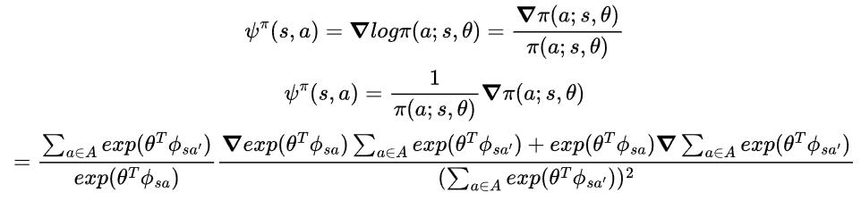 입니다. 이제 $\phi^{\pi}(s,a)$를 구해봅시다. 먼저 $\pi(a;s,\theta) \propto exp(\theta^{T}\phi_{sa})$ 이므로,