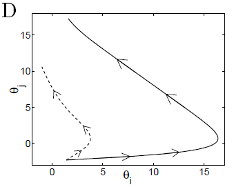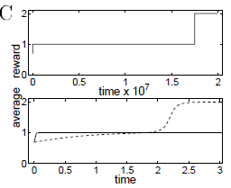 위의 그래프는 일반적인 gradient를 사용했을 때의 결과입니다. 무려 1500000 time이 흘러도 리워드는 1인 것을 확인할 수 있습니다. 반면 아래 그림의 점선 곡선은 natural gradient를 사용했을 때의 결과입니다. 시간이 겨우 2 time일 때 벌써 리워드는 1을 넘어가는 것을 확인할 수 있습니다. 그런데 natural gradient를 사용했을 때 초반에는 일반적인 gradient보다 리워드가 작습니다. 그 이유는 일반적인 gradient는 노드 i에 붙어있으려고 하기 때문입니다.