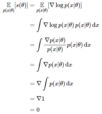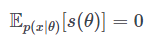 이 score 함수 $s(\theta)$는 log-likelihood의 경사도와 같습니다. 이 score 함수는 우리 모델에 대해 기댓값이 0이라는 성질을 가지고 있습니다. 즉,
