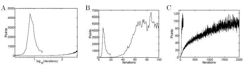 가장 먼저 그림 A는 두 가지 곡선을 보여줍니다. 위로 솟았다가 다시 내려온 곡선은 greedy policy iteration방법을 이용했을 때의 거동입니다.(단 선형 근사 함수를 사용하였음.) 그리고 그 밑에 아주 천천히 상승하고 있는 곡선은 일반적인 gradient 방법을 사용한 policy gradient method 방법을 이용했을 때의 모습입니다. 재밌는 점은 policy iteration을 사용했을 때 gradient method 방법을 사용했을 때보다 훨씬 빠르게 학습이 되었지만 갑자기 급격하게 떨어지는 모습을 볼 수 있습니다. 왜 그런지는 설명할 수는 없지만요.