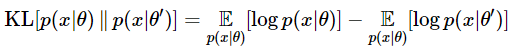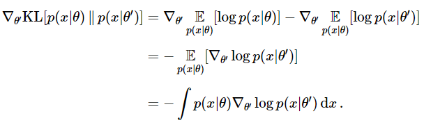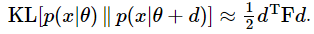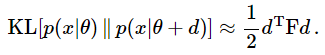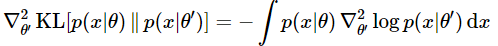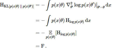 좀 더 수학적으로 표현하면 피셔 정보 행렬$F$는 $\theta^{'}=\theta$에서 $\theta^{'}$에 대한 두 분포 $p(x|\theta),\ p(x|\theta^{'})$의 KL-divergence의 Hessian입니다. 증명은 아래와 같습니다.
