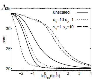 그리고 마지막 그림 C에서는 natural gradient method(왼쪽)과 일반적인 gradient method 방법을 사용했을 때의 거동을 비교하였습니다. natural gradient method가 초기에는 훨씬 빠르게 수렴하지만 최종적으로는 결국 같은 지점에 수렴함을 확인할 수 있습니다.
