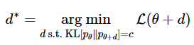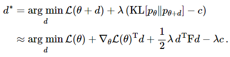 이제 분포 공간 상에서 loss function $\mathcal{L}(\theta)$를 최소화시키는 $\theta$의 방향 $d$을 구해봅시다. 그런데 분포 공간에서는 KL-divergence의 변화가 가장 큰 방향이 바로 $d$라는 것을 알고 있습니다. 일반적인 gradient descent에서 파라미터 공간에서 유클리디안 거리를 이용하여 $d$를 구했다면 natural gradient descent는 분포 공간에서 KL 거리를 이용하여 이 $d$를 구한 것입니다. 이 새로운 방향 $d$를수식으로 표현하면 아래와 같습니다.