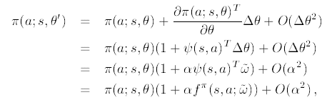 파라미터의 변화 $\Delta\theta$는 $\alpha\widetilde{\nabla }\eta(\theta)$이기 때문에, Theorem 1.에 의해 $\Delta\theta=\alpha\widetilde{\omega}$입니다, 따라서 정책의 변화량을 테일러 급수의 1차항으로 표현한다면 다음과 같습니다.