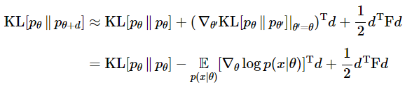이제 피셔 정보 행렬을 사용하여 gradient descent를 할 준비가 다 되었습니다. 가장 먼저 KL-divergence를 $\theta$근처에서의 테일러 급수로 표현할 것입니다. $d\to 0$일 때, 이 테일러 급수의 2차 항은 아래와 같습니다.