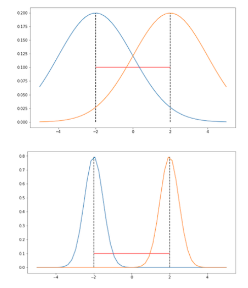 두 분포의 평균은 두 그림에서 모두 같지만, 분산은 서로 다릅니다. 분명하게 위 그림보다 아래 그림에서 분포의 차이가 더 크다는 것을 알 수 있습니다. 하지만 분포의 거리를 유클리디안 거리로 사용한다면, 위 그림과 아래 그림에서 두 분포의 거리는 같습니다. 우리의 직관과 매우 다른 결과를 보여주죠. 따라서 우리가 오직 파라미터 공간에서만 두 분포를 바라본다면, 이 파라미터들로 만들어지는 분포간의 정보를 상당 부분 잃게 됩니다. 이러한 이유로 파라미터 공간이 아닌 분포 공간에서 step을 취하는 Natural Gradient Descent 방법이 ‘자연스럽다'라고 말할 수 있는 것입니다.