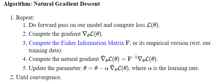 Natural Gradient Descent 알고리즘의 전체적인 흐름은 아래와 같습니다.