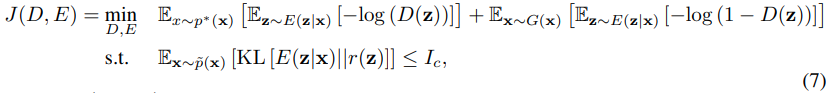 여기서 $\mathbb{E}_{x \sim p(x)}[KL[E(z|x)||r(z)]]$을 $I(X,Z)$ 대신에 사용하게 된다면 아래와 식(5)와 같은 목적함수를 얻을 수 있고 이는 다음과 같은 조건을 만족하게 됩니다. $\tilde{J}(q,E) \ge J(q,E)$